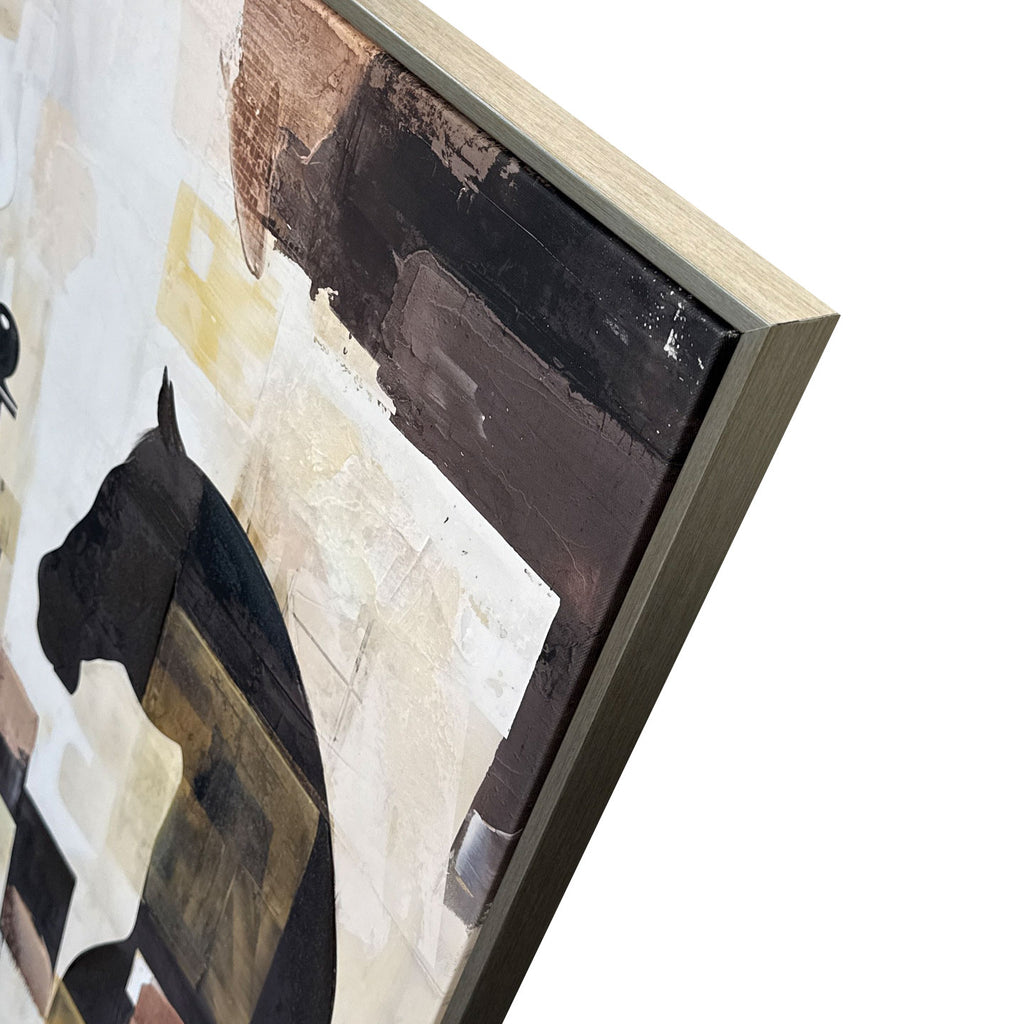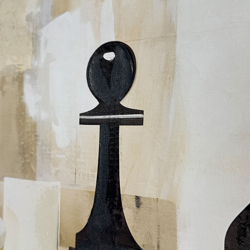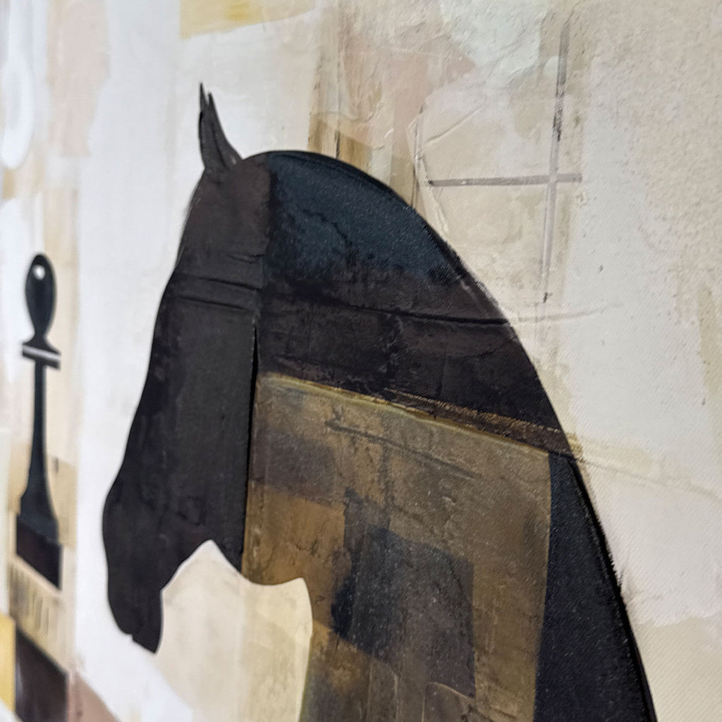 Il Quadro Scacchi di Agave trasforma l’iconografia di un gioco millenario in un potente elemento d’arredo contemporaneo. La composizione mette in risalto la silhouette di un cavallo e di un pedone, che emergono da una scacchiera astratta e destrutturata, dando vita a un’opera dal forte carattere simbolico e intellettuale.