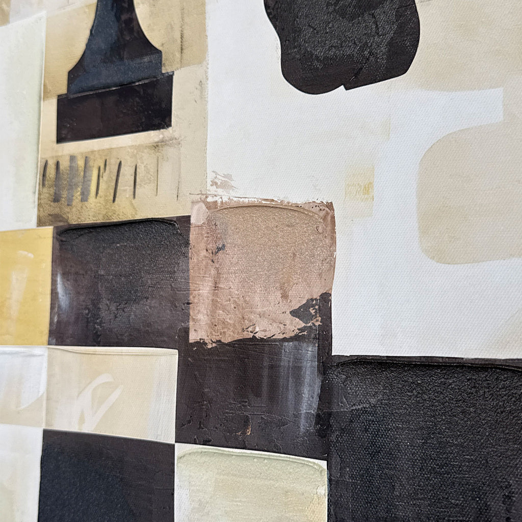 La tecnica materica artigianale crea un affascinante mosaico di tasselli, dove i toni profondi del nero e del bruno dialogano con delicate campiture ocra e panna, donando profondità, movimento e un elegante equilibrio cromatico.