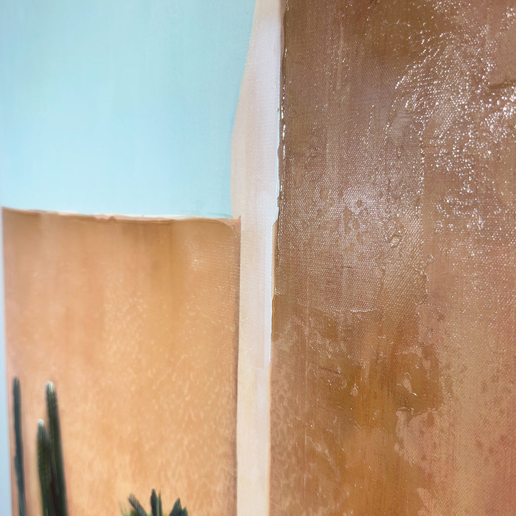 Le architetture color terracotta, il cielo terso e la presenza di cactus e piante grasse dialogano con una texture materica che dona profondità e realismo, trasformando la parete in uno spazio emozionale.