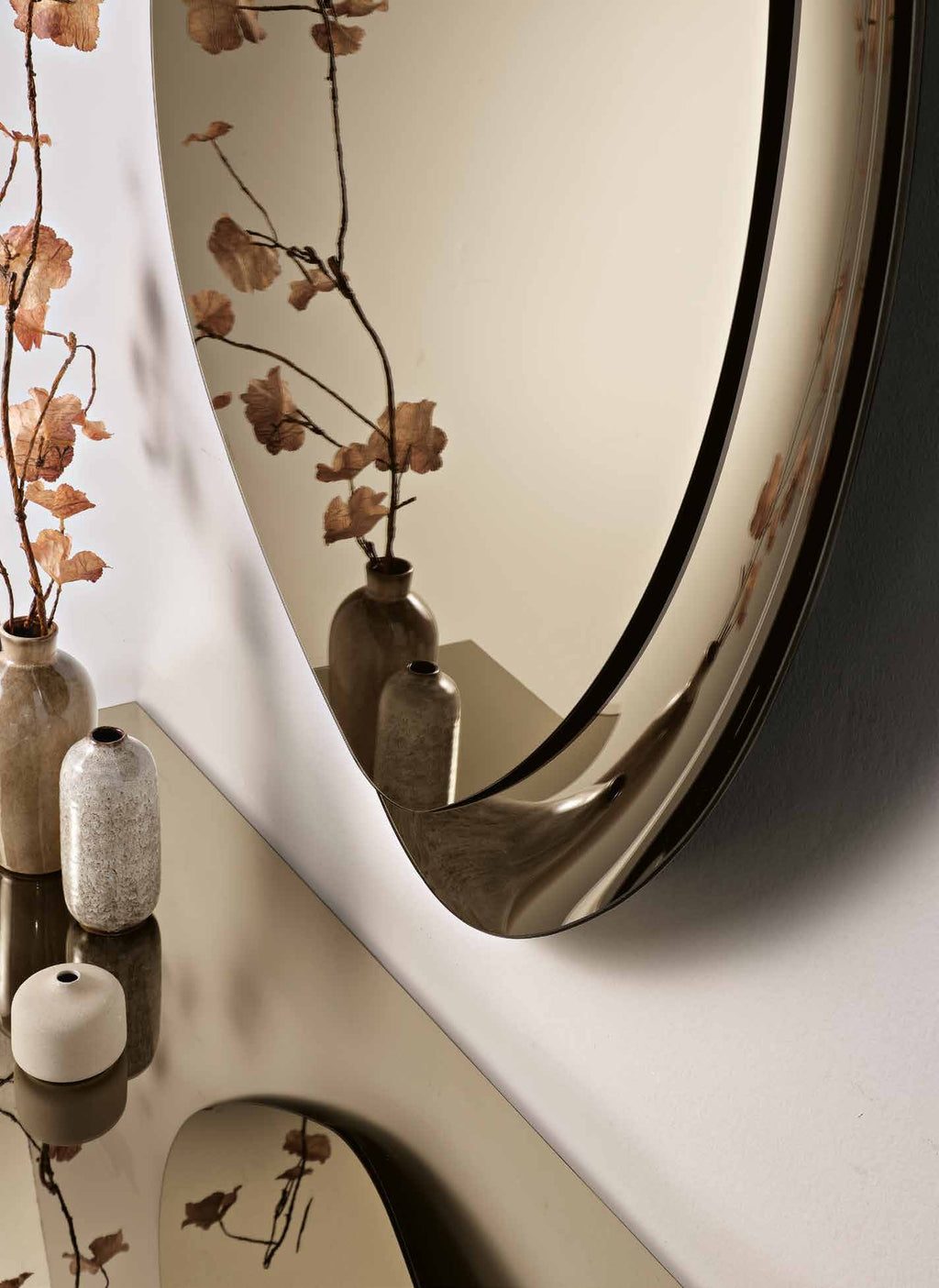 Definita da una caratteristica semi-cornice in vetro fuso tono su tono, Acai riflette la luce in modo morbido e naturale, donando profondità e preziosità allo spazio. Un complemento di design che va oltre la semplice funzione, trasformandosi in un gesto estetico che arreda.