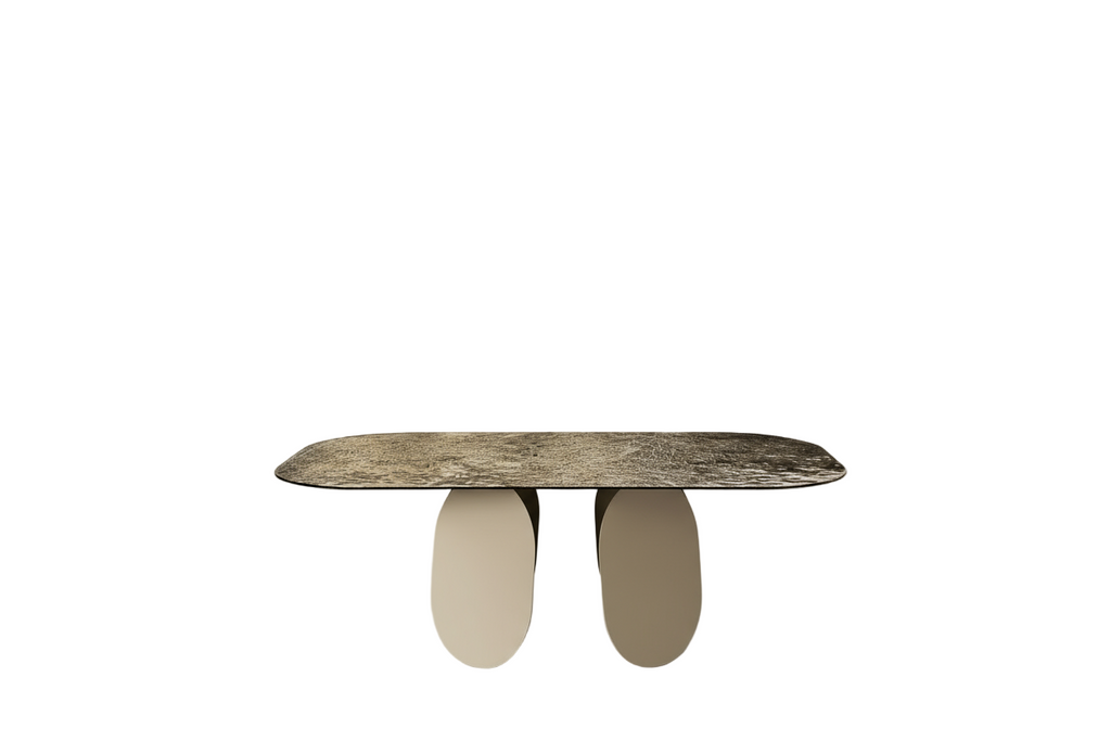 Il tavolo Maya di Capodarte unisce eleganza contemporanea e matericità decorativa. La sua base scultorea dal design importante sostiene un raffinato piano in vetro martellato retroargentato, che cattura la luce restituendo riflessi preziosi e tridimensionali. Un tavolo capace di diventare protagonista della zona living, perfetto per chi desidera uno stile ricercato e d’impatto.