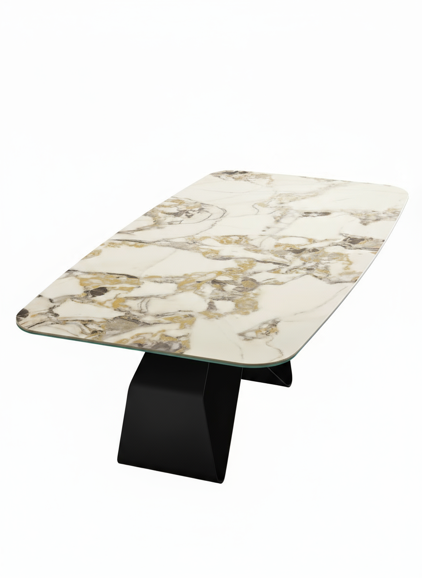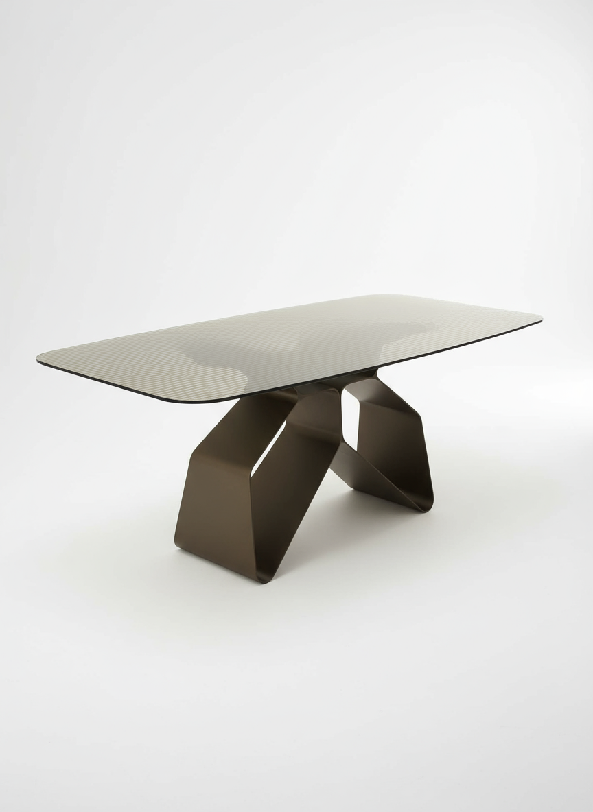 Il tavolo Swing di Capodarte unisce design contemporaneo e grande eleganza decorativa. Linee fluide e una base scultorea caratterizzano la struttura, mentre il piano — disponibile in pregiate finiture in vetro martellato, vetro rigato o ceramica effetto marmo — dona profondità, luce e personalità allo spazio.
