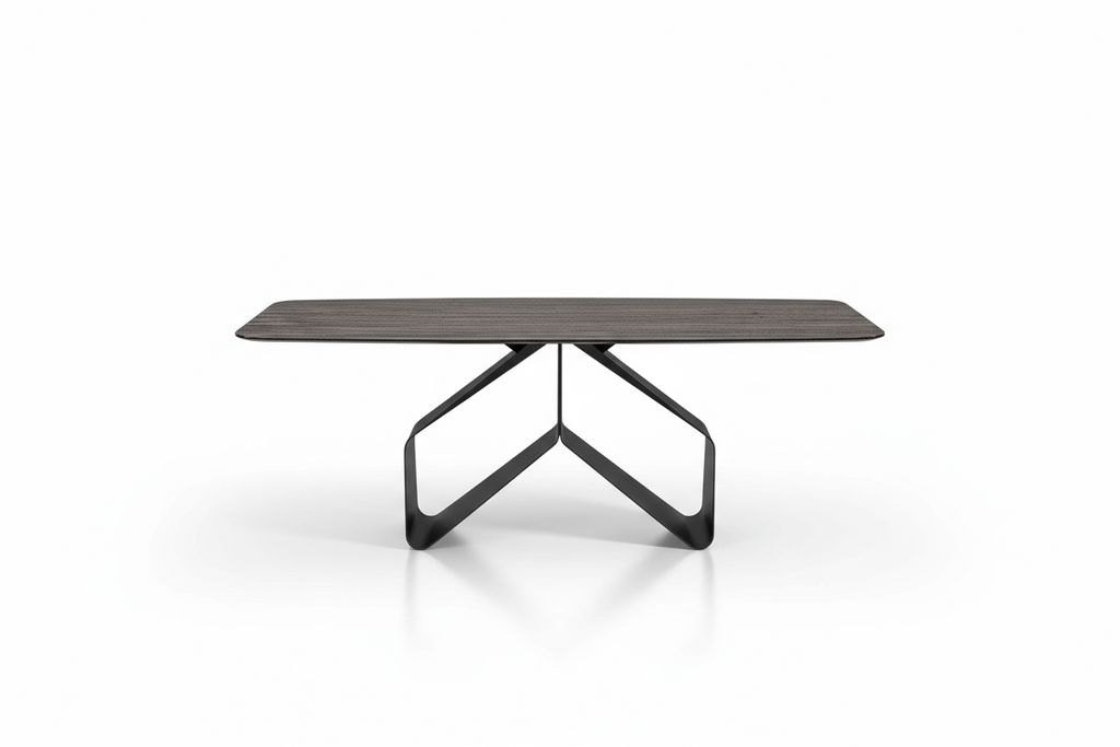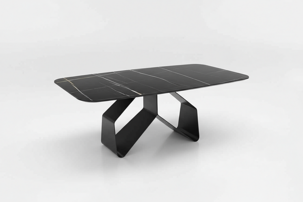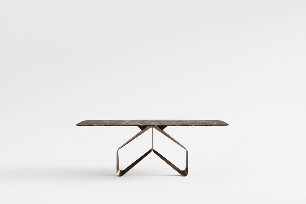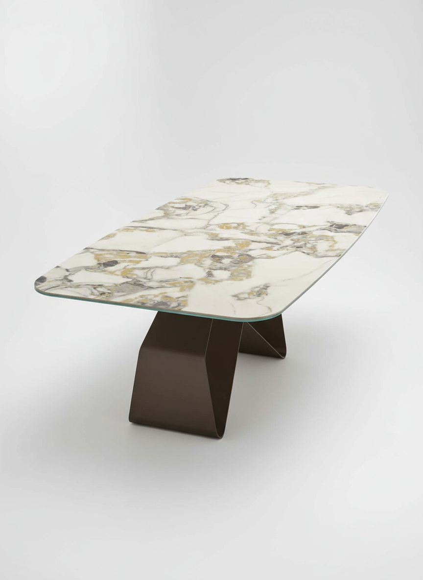 Swing è un tavolo di forte personalità estetica, che arreda come un vero elemento architettonico. Le varianti disponibili permettono di interpretarlo in chiave più calda, più contemporanea o più lussuosa, in base al piano scelto, rendendolo versatile e scenografico allo stesso tempo.
