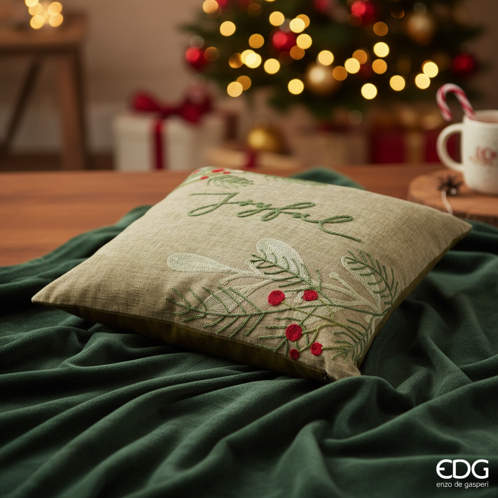 Con il suo vivace colore verde, le decorazioni di vischio e la scritta centrale ricamata "joyful", questo cuscino trasmette tutto lo spirito del Natale in modo raffinato e moderno.
