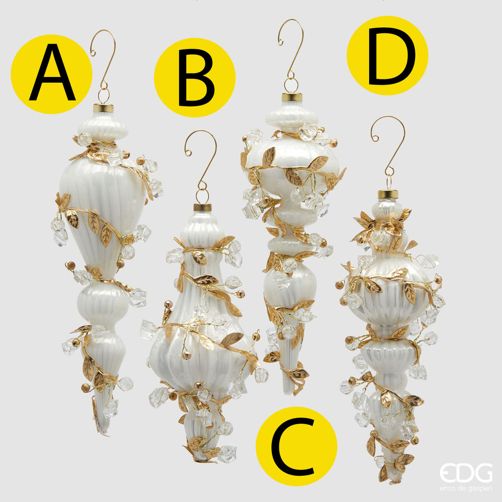 Ogni fuso ĆØ realizzato in vetroĀ e decorato con motivi barocchi in rilievo, glitter e sfumature iridescenti che riflettono la luce in modo delicato e avvolgente, creando un'atmosfera natalizia regale e luminosa.