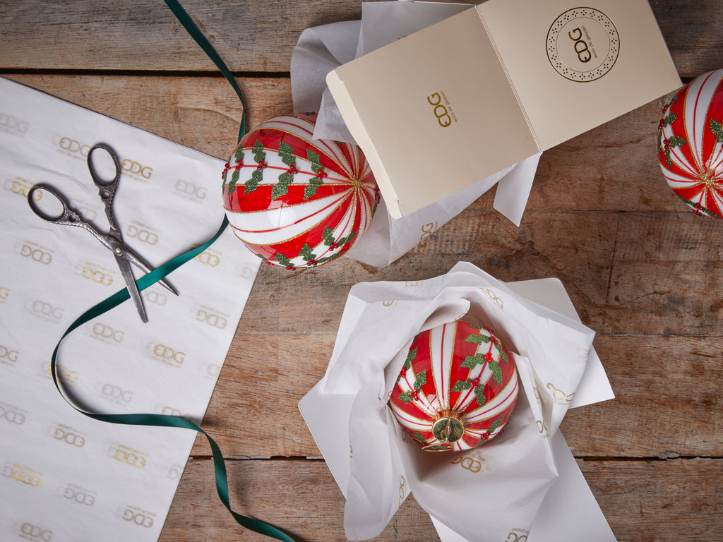 Rendi unico il tuo albero di Natale con la palla decorativa in vetro firmata Enzo De Gasperi, impreziosita da un elegante motivo a fasce rosse e bianche, arricchito da dettagli di vischio verde e oro.