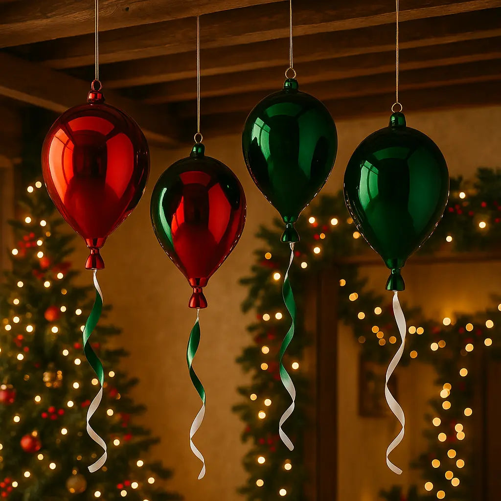 🎁 Consiglio Romano Mobili: crea un angolo scenografico sospendendo più palloncini a diverse altezze o abbinandoli ad altri ornamenti in vetro per un effetto “giostra natalizia” ricercato e unico.