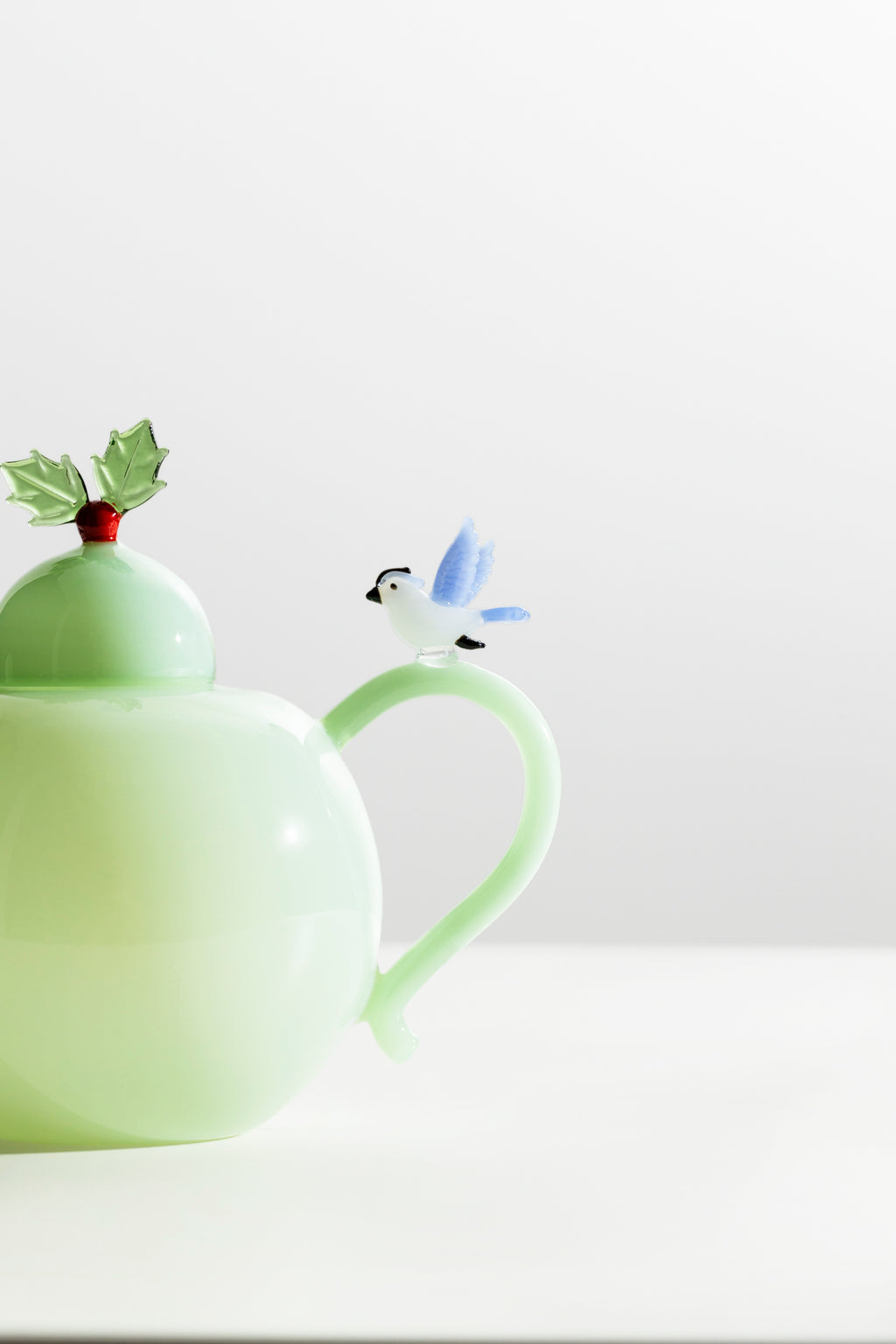 Il manico decorato con un piccolo uccellino e il coperchio sormontato da rami di agrifoglio trasformano questa teiera in un oggetto poetico, perfetto da collezionare o regalare.