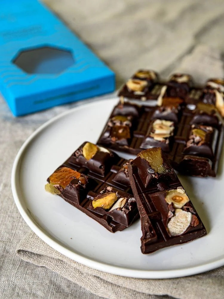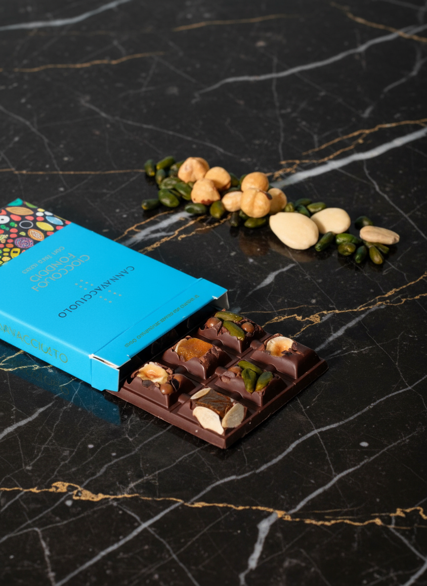 Un’esperienza sensoriale intensa firmata Chef Antonino Cannavacciuolo. La tavoletta al cioccolato fondente con frutta secca è un capolavoro di equilibrio e gusto: il cioccolato, lavorato con maestria dai pasticceri del laboratorio, incontra la croccantezza di nocciole, pistacchi e mandorle per un piacere irresistibile.