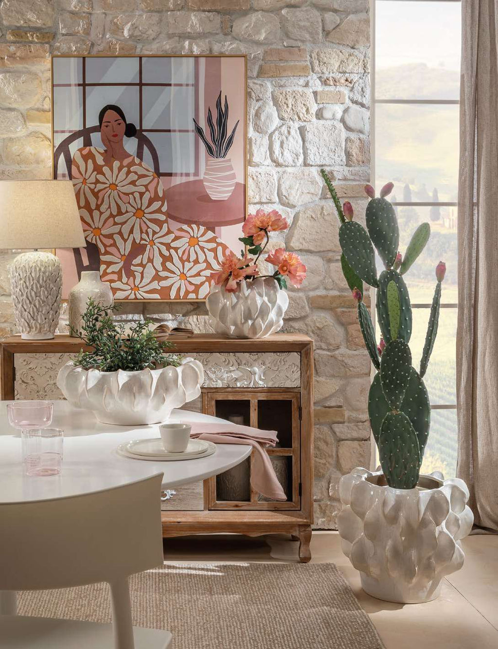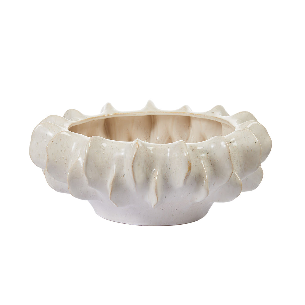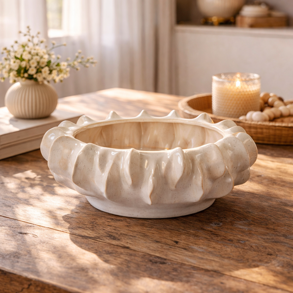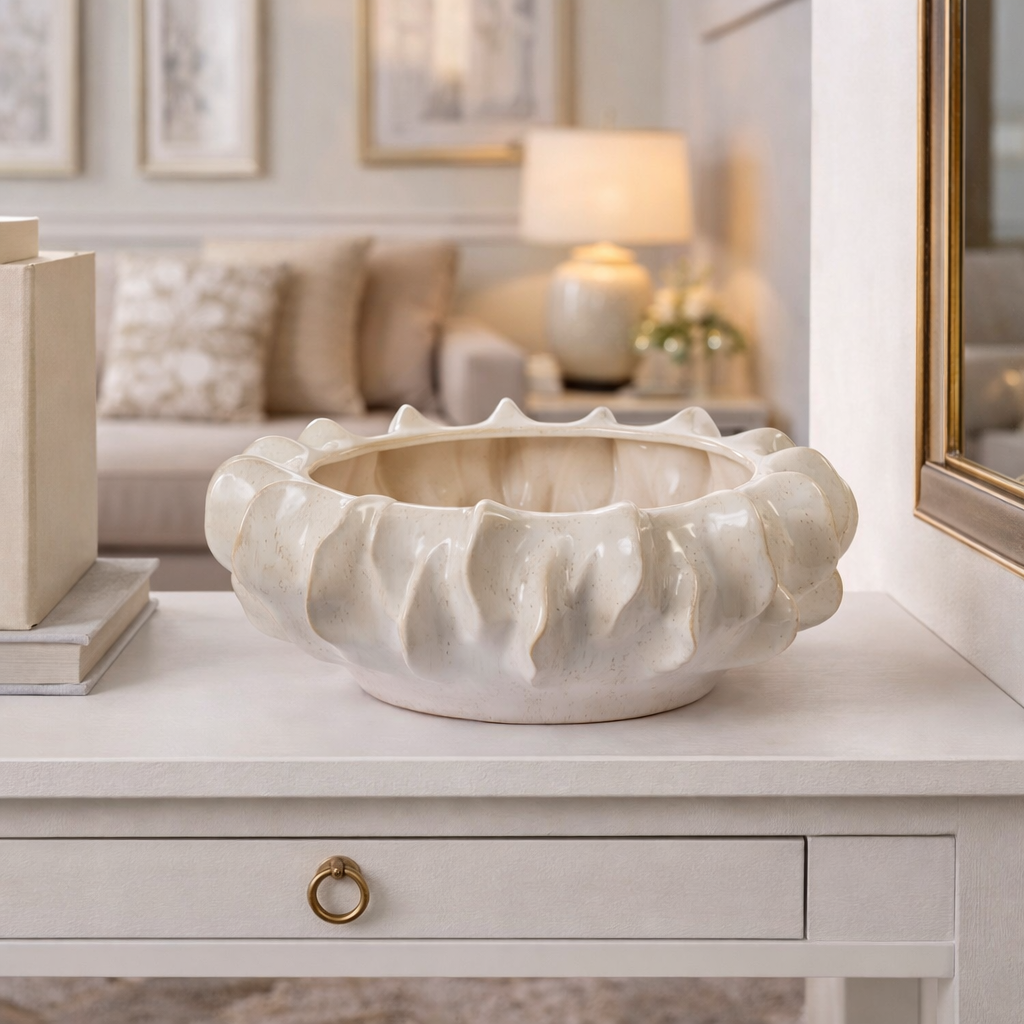 La finitura avorio lucido con leggere sfumature naturali esalta la texture materica della ceramica, rendendo il centrotavola perfetto sia come elemento decorativo da solo sia per ospitare composizioni floreali o oggetti ornamentali.
