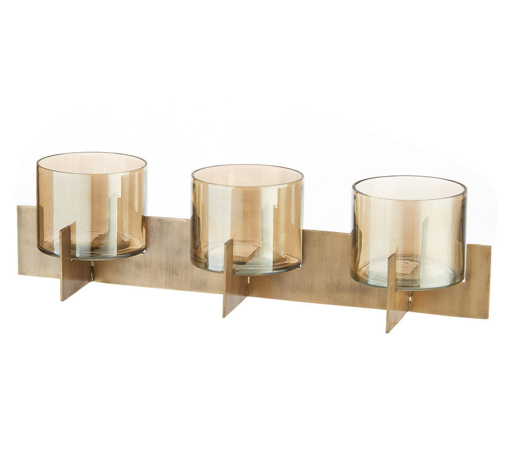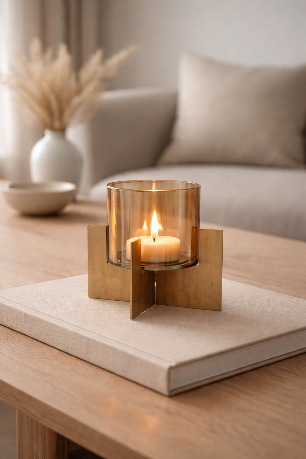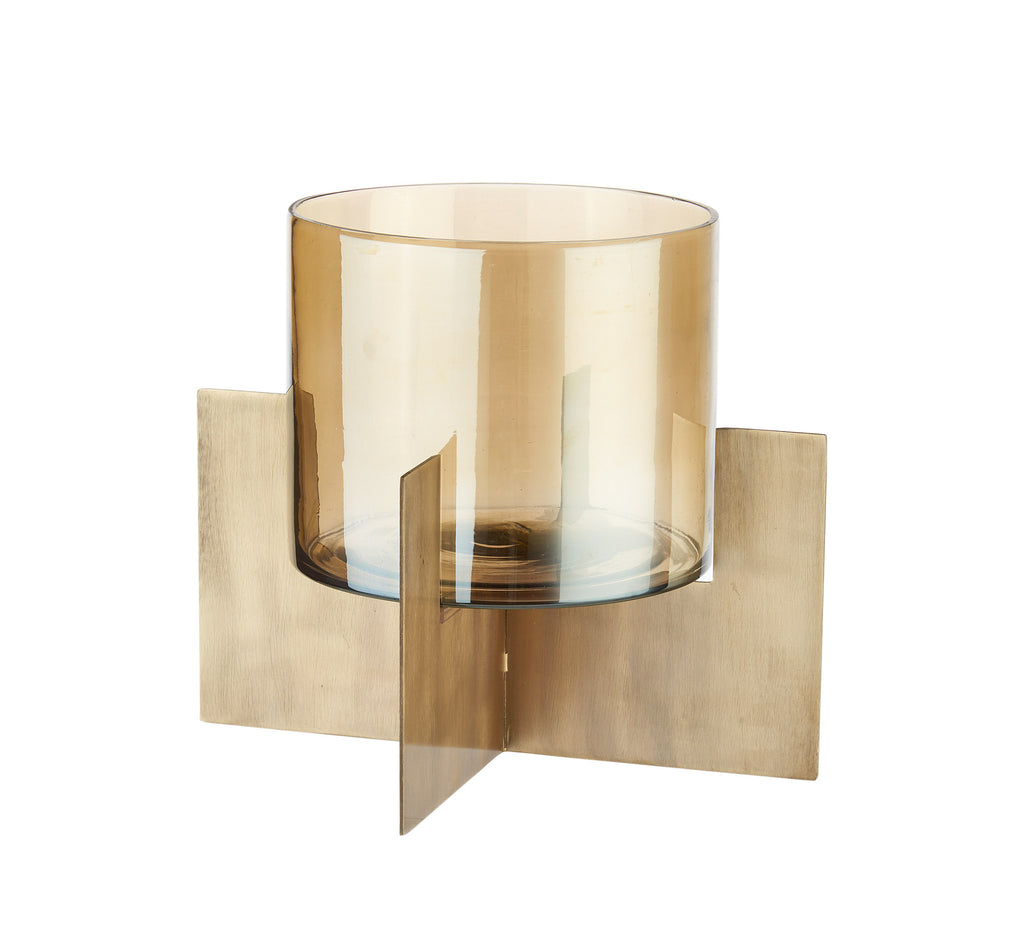 Realizzato in metallo con finitura bronzo, è completato da un contenitore in vetro che protegge la fiamma e ne amplifica la luce, creando riflessi morbidi e avvolgenti. Disponibile in due misure, è ideale sia come elemento singolo che in composizione.
