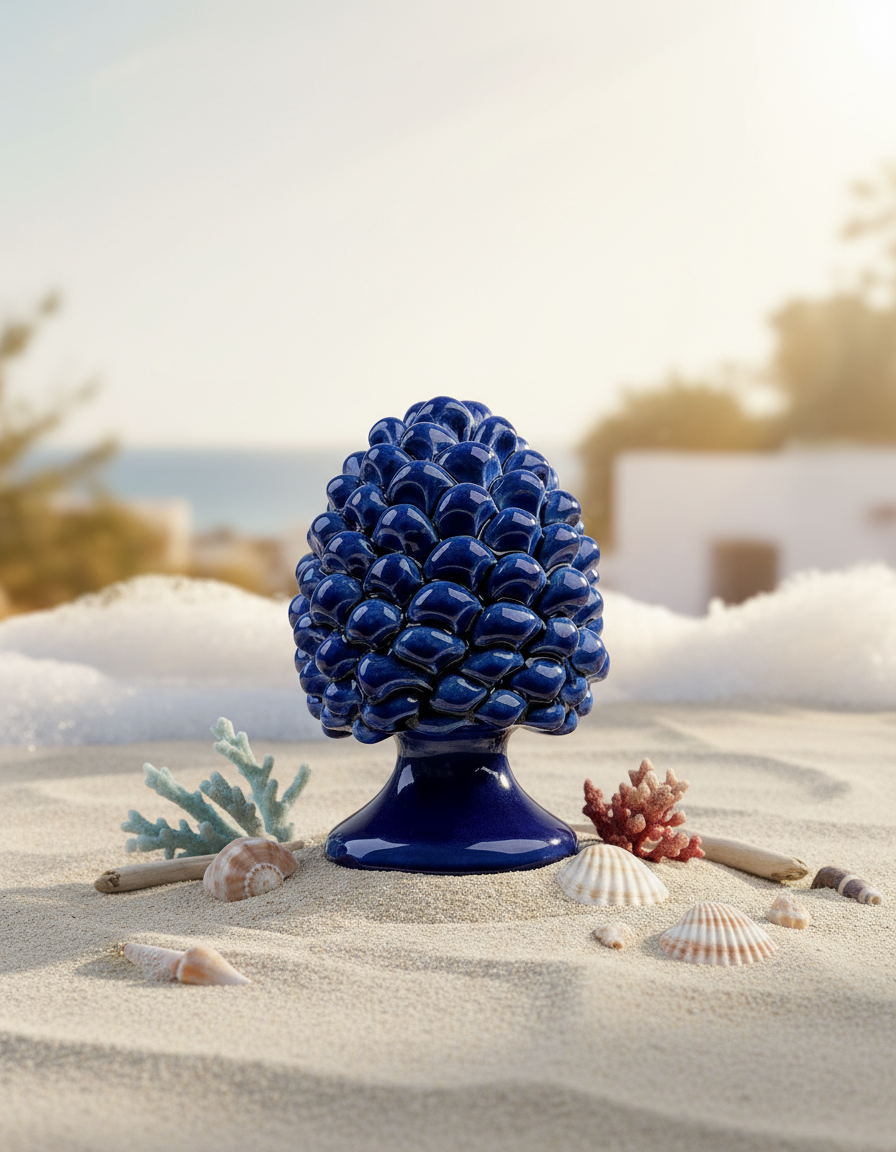 L’interpretazione simbolica della Pigna racchiude in sé l’espressione della fertilità, dell’immortalità e del benessere. Generata da una pianta sempreverde, il pino, fin dall’antichità la pigna è divenuta un ornamento di buon auspicio e prosperità per la casa e per la famiglia che la abita. In virtù di questo significato benefico, possedere una pigna in ceramica è una pratica diffusa in tutta la Sicilia. Essa orna generalmente gli ingressi dell’abitazione, come porte o cancelli, ma si può anche scorgere in bellavista su terrazze e balconi nei quali la pigna viene posta come simbolo di apertura e ospitalità. La creazione di questo oggetto avviene attraverso una lavorazione a mano: l’artigiano utilizza il tornio per plasmare due pezzi di argilla che prenderanno la forma della calotta di base e del piede. Una volta unite le due parti si continua applicando singolarmente ogni brattea. Infine la terracotta viene impreziosita con smalti colorati, lustri e oro.