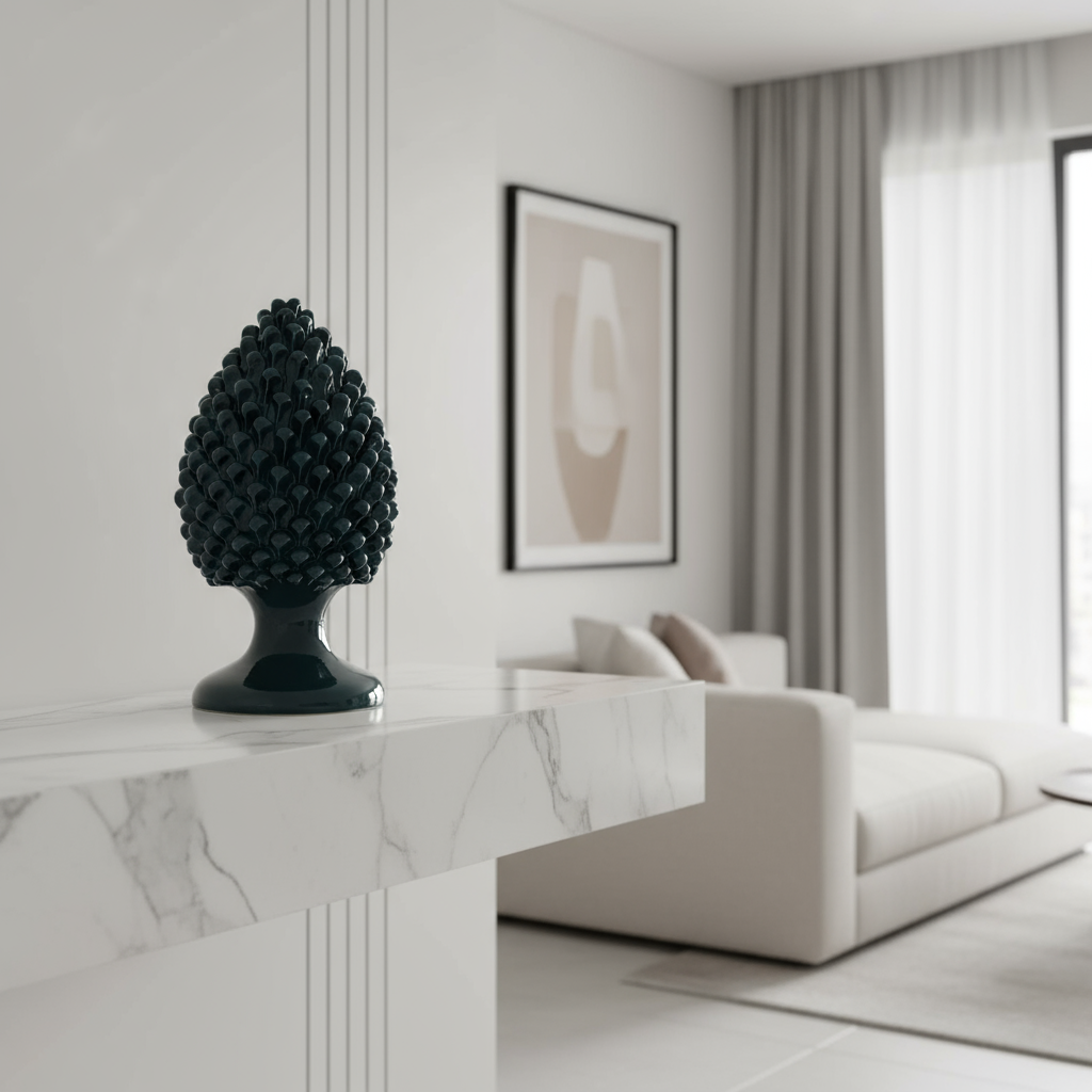L’interpretazione simbolica della Pigna racchiude in sé l’espressione della fertilità, dell’immortalità e del benessere. Generata da una pianta sempreverde, il pino, fin dall’antichità la pigna è divenuta un ornamento di buon auspicio e prosperità per la casa e per la famiglia che la abita. In virtù di questo significato benefico, possedere una pigna in ceramica è una pratica diffusa in tutta la Sicilia. Essa orna generalmente gli ingressi dell’abitazione, come porte o cancelli, ma si può anche scorgere in bellavista su terrazze e balconi nei quali la pigna viene posta come simbolo di apertura e ospitalità. La creazione di questo oggetto avviene attraverso una lavorazione a mano: l’artigiano utilizza il tornio per plasmare due pezzi di argilla che prenderanno la forma della calotta di base e del piede. Una volta unite le due parti si continua applicando singolarmente ogni brattea. Infine la terracotta viene impreziosita con smalti colorati, lustri e oro.