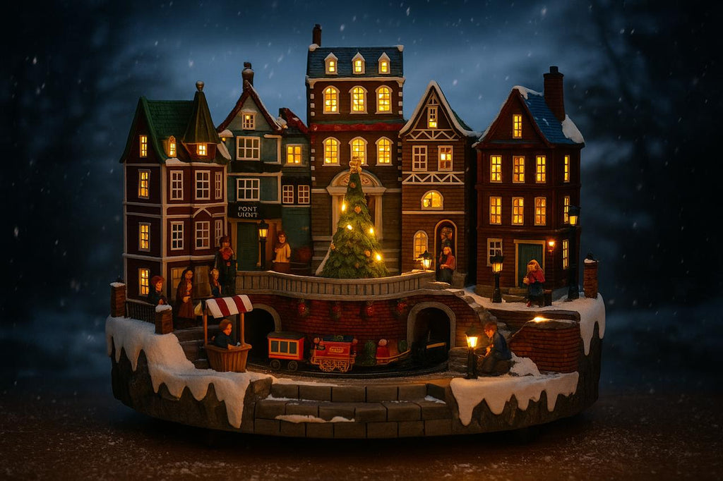 I dettagli dei palazzi, nei colori dai toni caldi, e l'illuminazione a Led creano un'ambientazione magica, mentre l'albero e il trenino che girano, aggiungono un tocco di nostalgia e gioia alle tue feste.