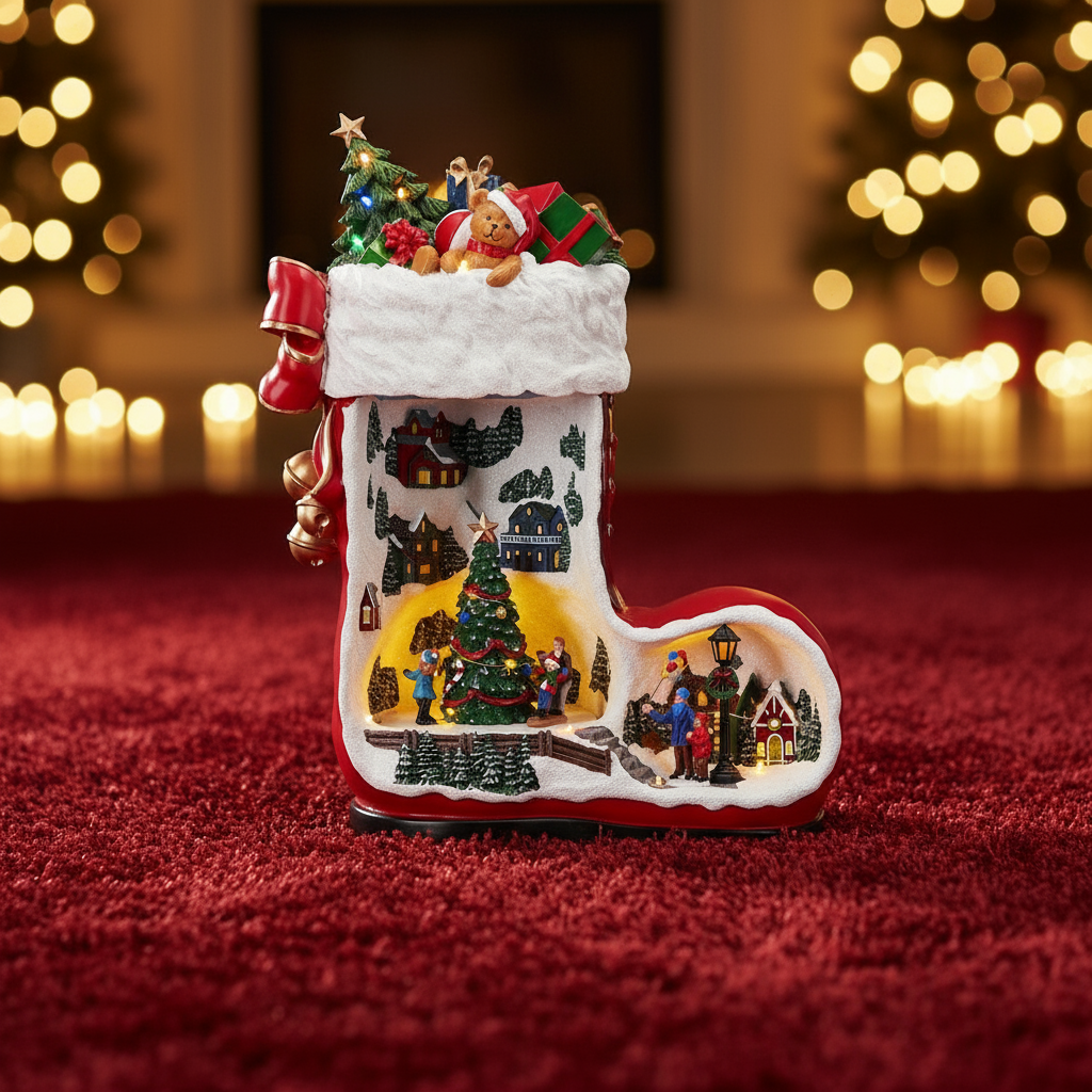 La forma di uno stivale tradizionale si trasforma in un piccolo mondo incantato in cui prende vita una scena animata ricca di dettagli, perfetta per donare calore, atmosfera e suggestione agli ambienti durante le feste.
