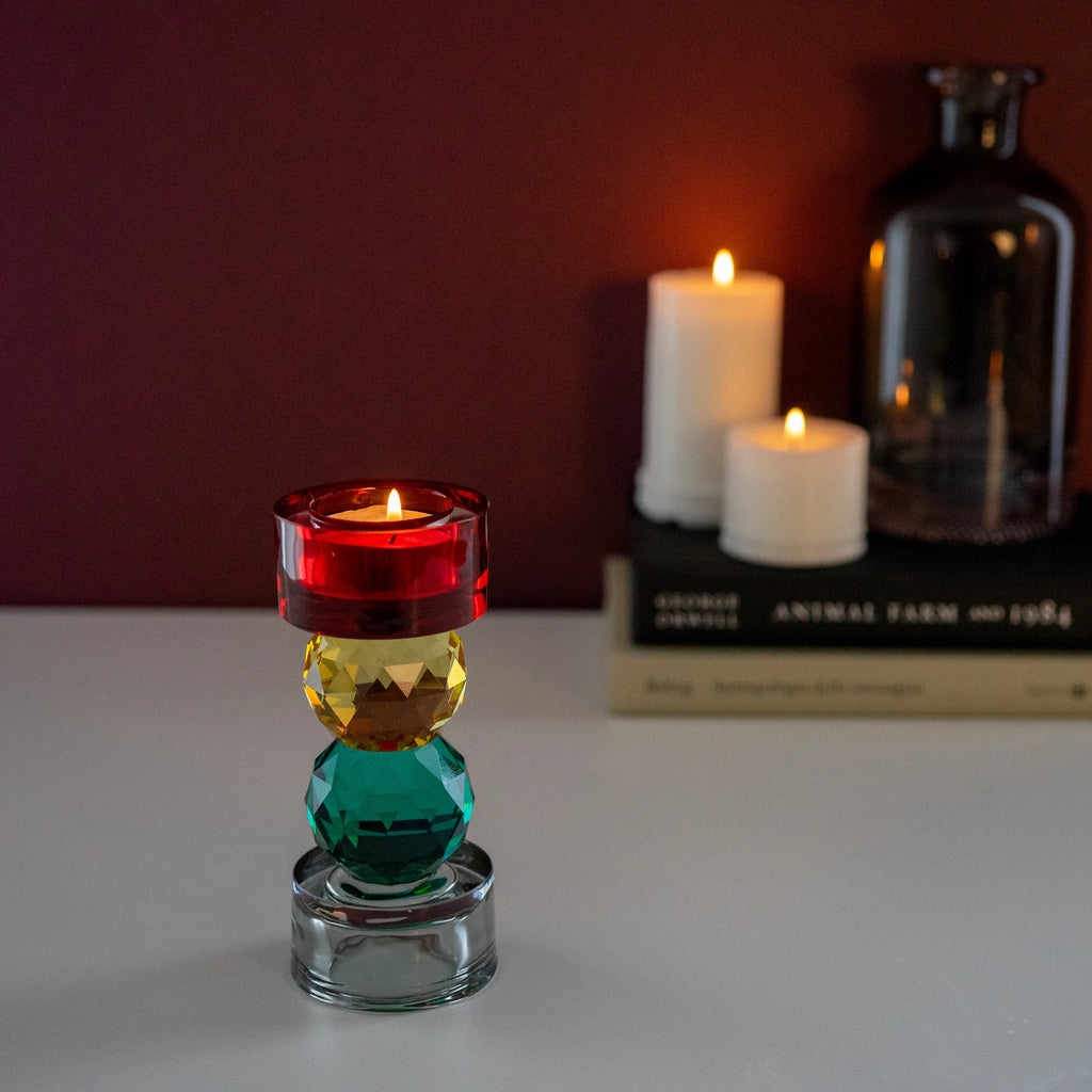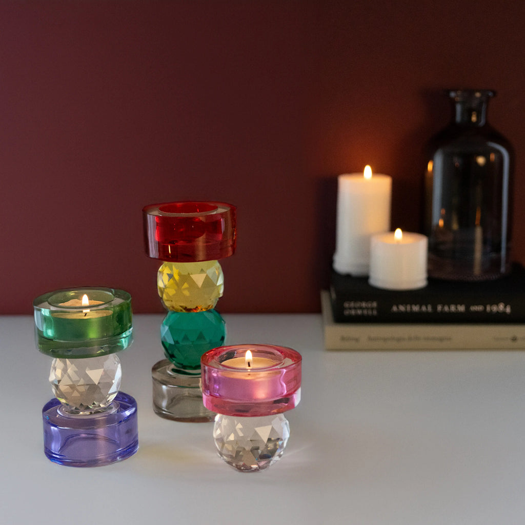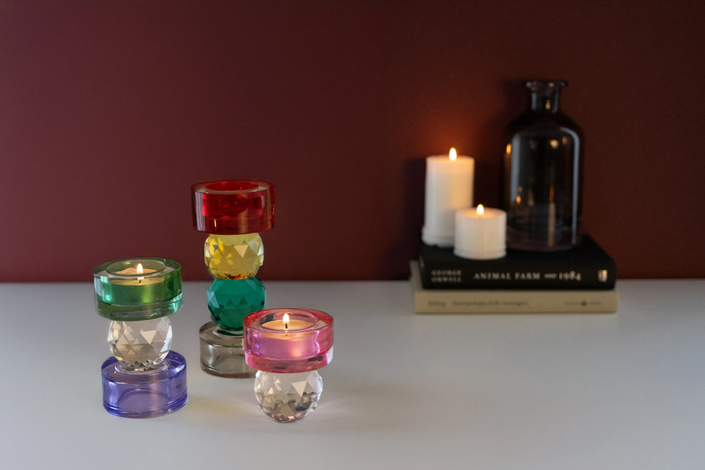 Realizzato con una lavorazione effetto diamante, presenta superfici sfaccettate che catturano e riflettono la luce della candela, donando profondità e brillantezza all’ambiente. Perfetto su tavoli, consolle e centrotavola, si inserisce con naturalezza in contesti moderni, glamour o contemporanei.